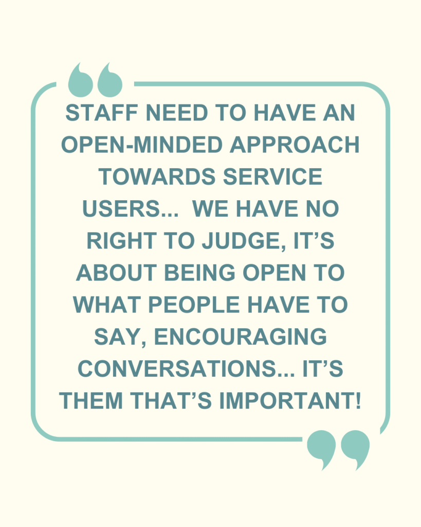 “Staff need to have an open-minded approach towards Service Users, as many can feel judged and misunderstood, which stops them getting the right care. We have no right to judge, it’s about being open to what people have to say, encouraging conversations, and reminding them it’s person-centred care. It’s them that’s important.”