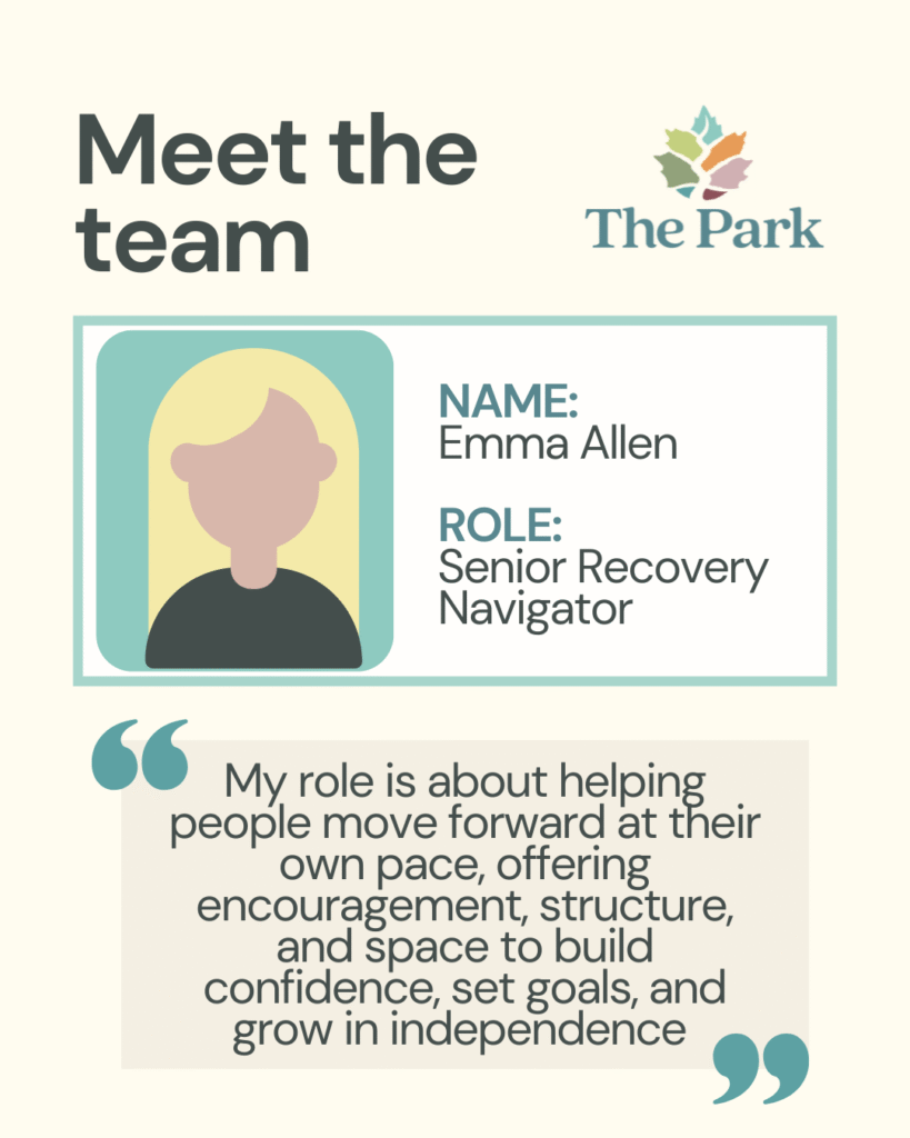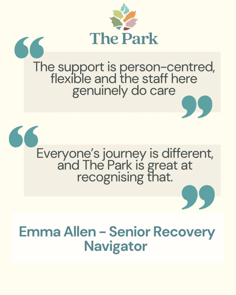 Everyone’s journey is different, and The Park is great at recognising that. It’s about celebrating every win, especially the small ones! It’s not all serious faces and clinical talk, there’s a lot of laughter, creativity and proper human connection. The support is person-centred, flexible and the staff here genuinely do care.